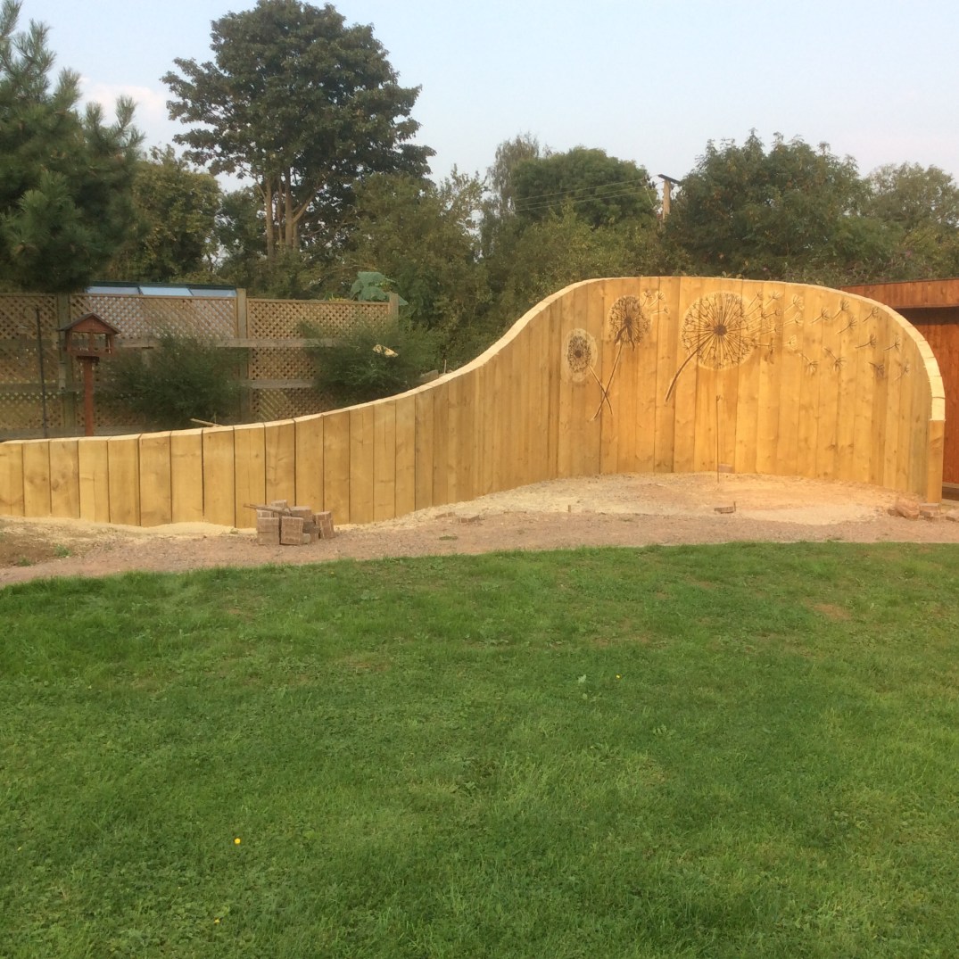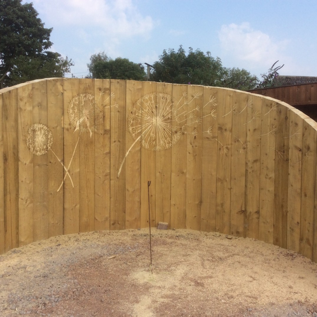 A continuos curve was then cut to create a feature wall and a blank canvas for chainsaw art. The theme of ‘dandelions’ was chosen by the client and these were then designed at carved with a small chainsaw.